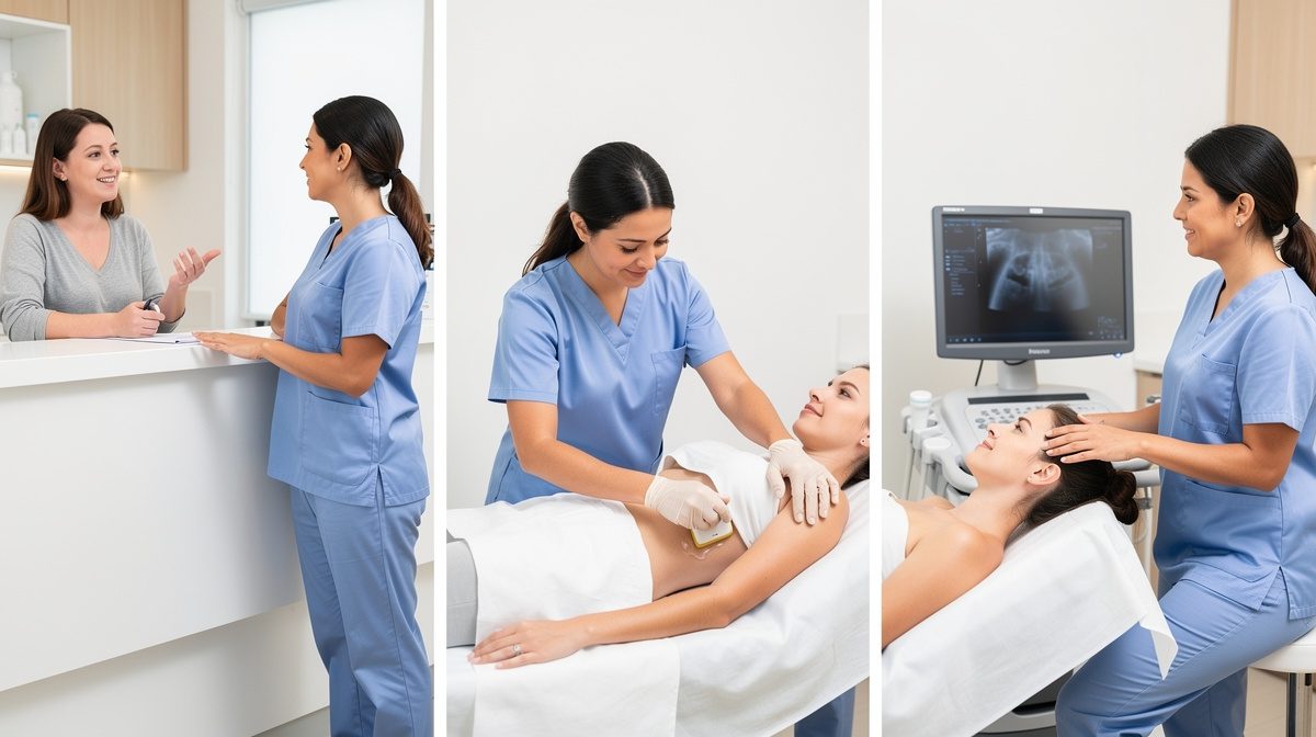 L'échographie pelvienne se déroule en position allongée, dans une pièce sombre. Le médecin applique un gel sur l'abdomen ou introduit une sonde dans le vagin ou le rectum pour visualiser les organes pelviens en temps réel grâce aux ultrasons.