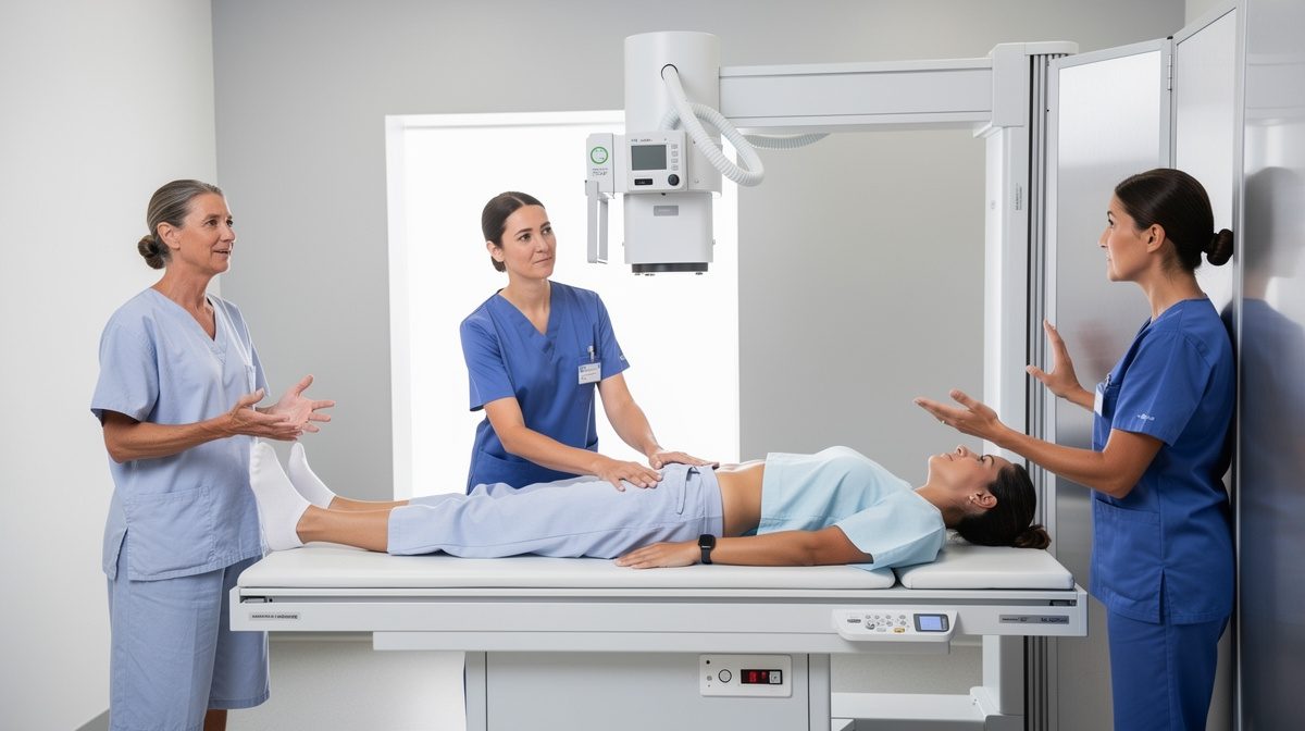 Une fois les formalités administratives complétées, le manipulateur en radiologie vous accueille et vous guide vers la salle d'examen. Vous devrez enlever vos vêtements couvrant la zone lombaire et retirer tout objet métallique restant (ceinture, soutien-gorge à armatures, clés dans les poches). Une blouse peut vous être fournie selon les centres. Le manipulateur vous explique le déroulement de l'examen et les différentes positions à adopter. L'examen comprend généralement des clichés de face et de profil, parfois complétés par des incidences spécialisées comme des clichés dynamiques en flexion-extension ou des clichés trois-quarts pour apprécier certaines zones spécifiques du rachis lombaire.
