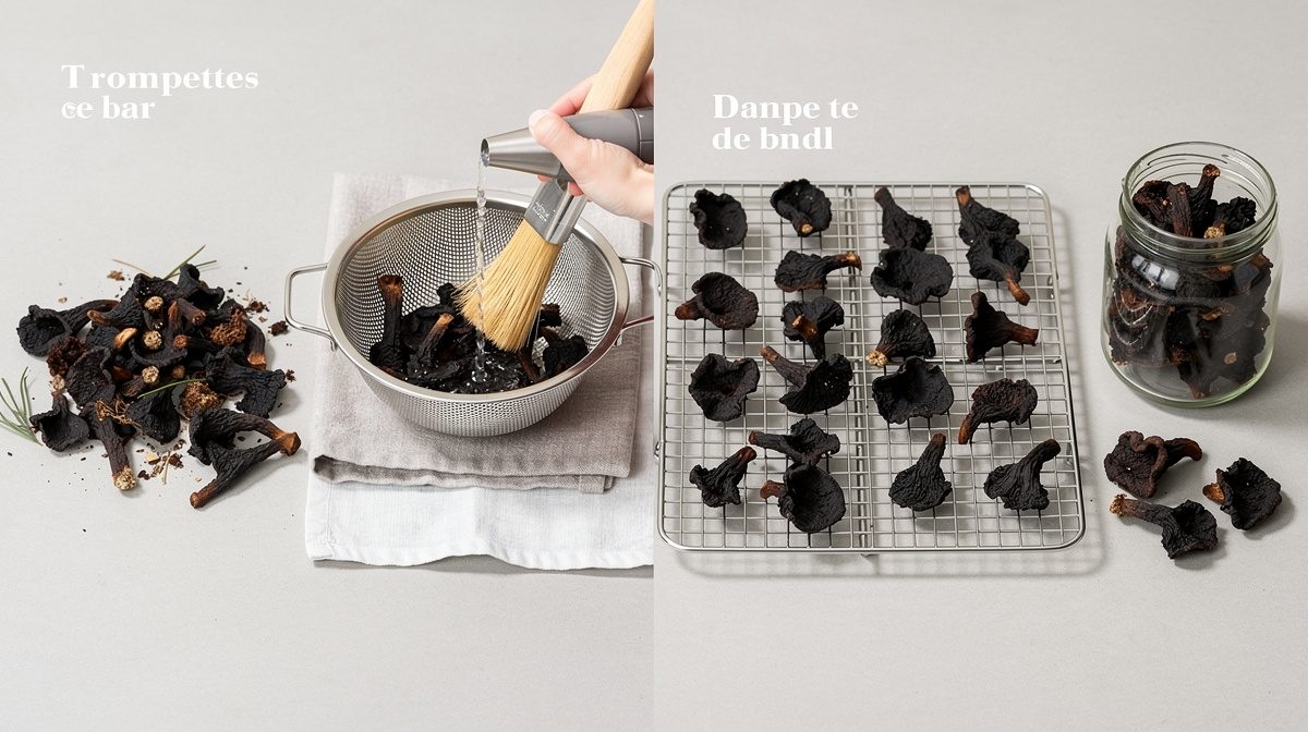 Avant toute opération de séchage, le nettoyage des trompettes de la mort est une étape cruciale. Ces champignons à la forme d'entonnoir retiennent facilement terre et débris dans leurs replis. Secouez-les d'abord en extérieur pour éliminer les gros résidus. Utilisez ensuite une brosse à poils souples ou un pinceau pour retirer délicatement la terre restante. Évitez absolument de les tremper dans l'eau : leur texture poreuse absorberait l'humidité comme une éponge, ce qui compromettrait le séchage. Si certains spécimens sont très sales, passez-les rapidement sous un filet d'eau froide puis séchez-les immédiatement avec un torchon propre ou du papier absorbant. Coupez la base terreuse des pieds et triez vos champignons en ne gardant que les spécimens sains, sans traces de moisissure.