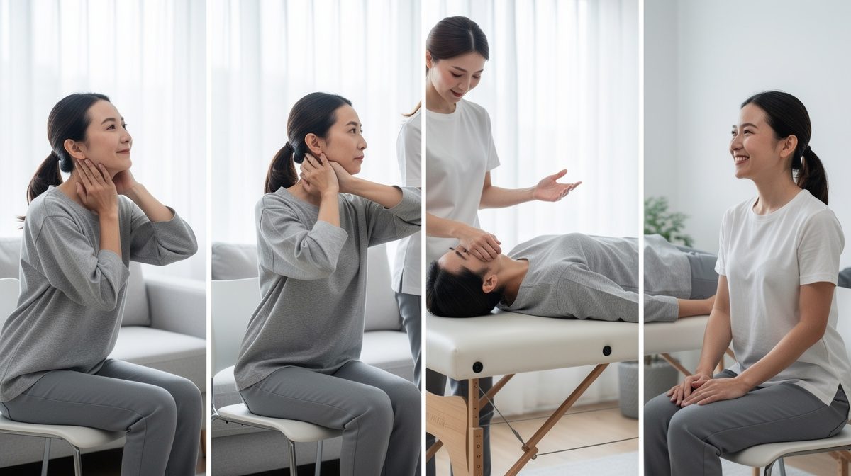 Les exercices de mobilité constituent la pierre angulaire du traitement des vertiges cervicaux. Commencez par des mouvements doux de rotation de la tête, d'inclinaisons latérales et de flexion-extension, en les réalisant lentement et de manière contrôlée. L'exercice d'inclinaison du menton est particulièrement efficace : assis droit, abaissez votre menton vers le bas sans incliner le cou, maintenez 10 secondes, répétez 10 fois, 3 fois par jour. Pour l'extension du cou, inclinez la tête vers l'arrière puis tournez-la doucement à droite et à gauche, 10 fois par jour. Pratiquez également la rétropulsion de la tête pendant la phase respiratoire pour réduire l'avancement de la tête. Ces exercices rétablissent le manque de mobilité et améliorent la proprioception cervicale, essentielle pour l'équilibre.