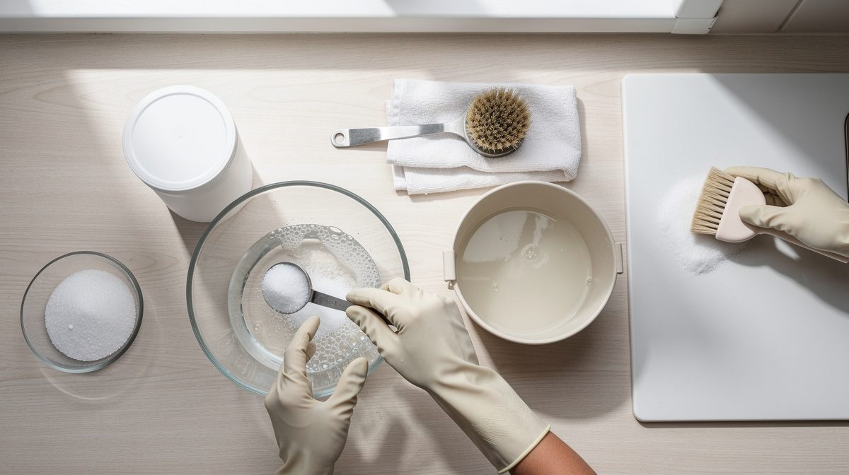 Préparez une solution nettoyante standard en diluant 3 cuillères à soupe de percarbonate dans 1 litre d'eau chaude. Utilisez ce mélange pour nettoyer les plans de travail, éviers et surfaces de cuisson. Pour la vaisselle tachée ou les boîtes alimentaires en plastique, ajoutez 30 à 60 g de percarbonate directement dans le récipient avec de l'eau chaude et laissez tremper pendant au moins 30 minutes. Pour les casseroles et poêles brûlées, remplissez-les d'eau bien chaude, ajoutez 2 cuillères à soupe de percarbonate et laissez agir quelques heures avant de nettoyer. Pour détartrer la cafetière, utilisez la préparation standard, laissez refroidir puis versez le mélange dans la cafetière. Le percarbonate élimine également les taches de thé ou café au fond des tasses et fait briller les surfaces sans effort.
