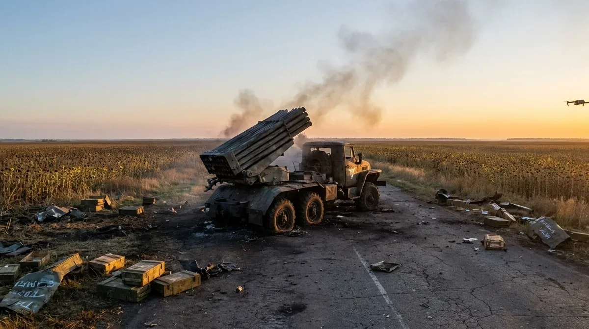 Le drone ukrainien a détecté la cible sur l’E58 entre Chekhorad et Udachne [11], a survolé sans être inquiété un véhicule d’escorte et deux camions ZU-23-2 [13][14], puis a frappé un véhicule « qui préparait ou venait de tirer une salve » [15]. Le protocole de repli aurait dû s’enclencher au plus tard à l’instant zéro de la salve. Plusieurs hypothèses peuvent être avancées, qu’aucune source consultée ne tranche: la cabine est restée occupée à corriger les coordonnées d’une seconde salve, le convoi d’escorte n’a pas détecté l’approche du drone, ou le commandant a sous-estimé la pénétration ukrainienne sur cet axe arrière. Les canons ZU-23-2 du convoi sont des pièces antiaériennes d’origine soviétique, conçues pour des aéronefs habités plutôt que pour des cibles aériennes de petite taille évoluant à basse altitude.