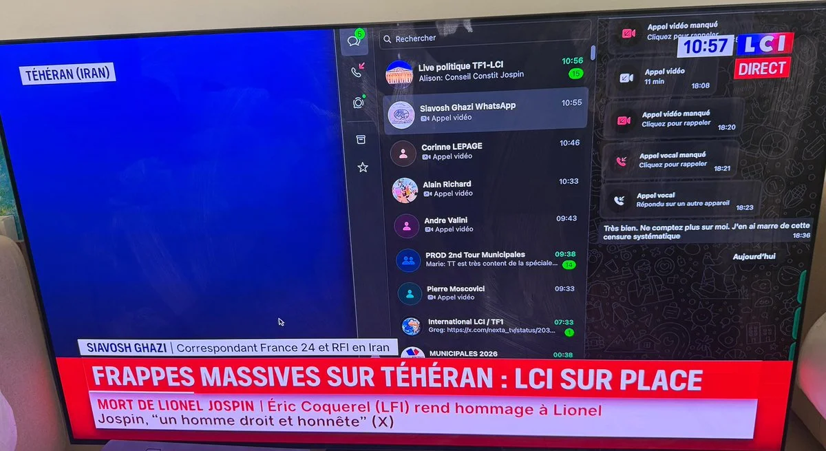 Ce lundi 23 mars, un tweet du compte @jon_delorraine circule sur X, accompagné d’une capture d’écran saisissante. On y voit l’écran de LCI affichant en direct une liste de conversations WhatsApp, avec notamment le contact « Siavosh Ghazi WhatsApp » et, sur la droite, un message se terminant par : « Très bien. Ne comptez plus sur moi. J’en ai marre de cette censure systématique. »