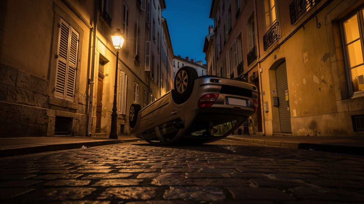 Une voiture s’est retournée jeudi 23 avril 2026 dans la rue Seguin, une artère à sens unique du centre-ville de Lyon. Selon Le Progrès, l’accident s’est produit vers 19h30, laissant le véhicule en équilibre instable sur son toit.