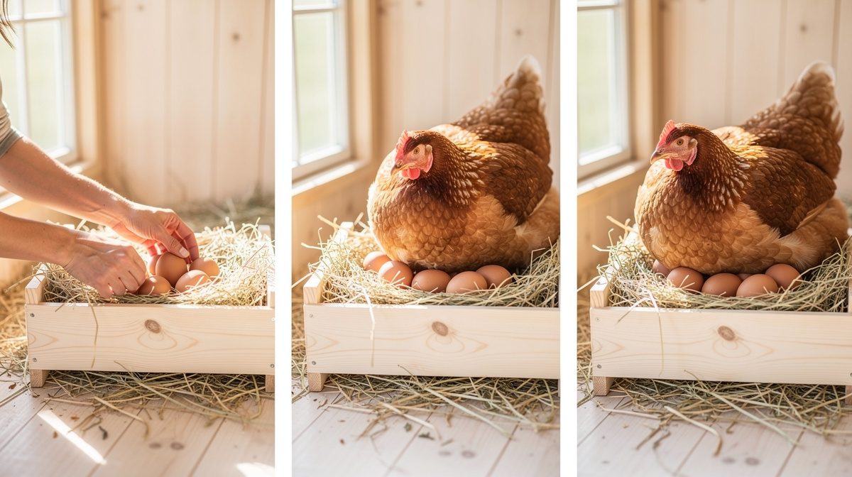 Reconnaître une poule couveuse est essentiel pour agir rapidement. Les signes caractéristiques incluent : elle ne quitte plus le nid ou très rarement, émet des gloussements différents et monotones, gonfle ses plumes quand on l'approche et peut devenir agressive. Sa crête devient pâle et rabougrie, elle perd ses plumes abdominales révélant une peau rougeâtre. La poule reste prostrée sur le nid même en l'absence d'œufs. Elle cesse complètement de pondre pendant toute la durée de la couvaison. Son comportement change : elle devient plus irritable et protectrice. Elle peut taper le sol avec ses pattes et émettre des vocalisations douces. Ces symptômes apparaissent progressivement et s'intensifient lorsque la couvaison s'installe vraiment.