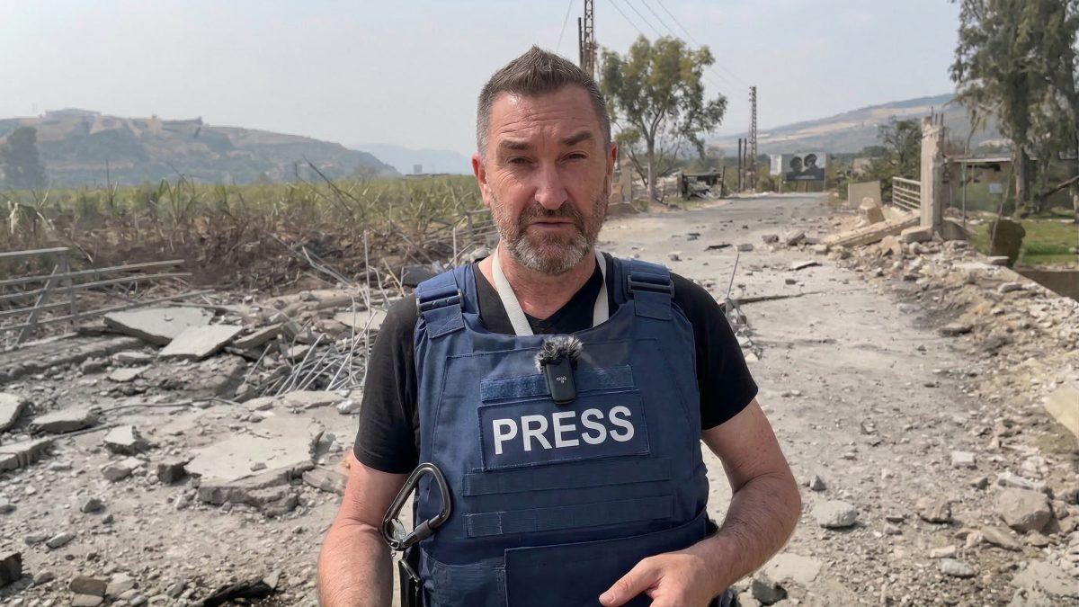 Le journaliste irlandais et son caméraman ont été touchés par une explosion pendant un direct depuis le sud du Liban, gilet PRESS visible à l'écran.
