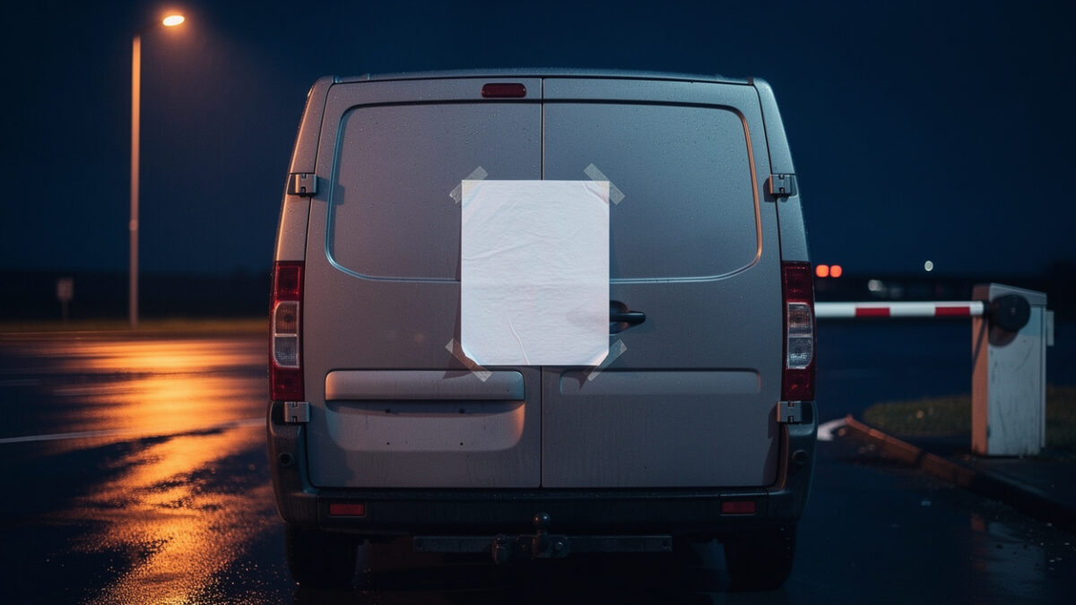 Le van était identifiable uniquement grâce à une feuille A4 collée sur le coffre. Il était garé à proximité des contrôles douaniers, pas dans la zone habituelle d’embarquement. Portes et fenêtres fermées, conducteur au téléphone : le véhicule n’attirait pas l’attention.